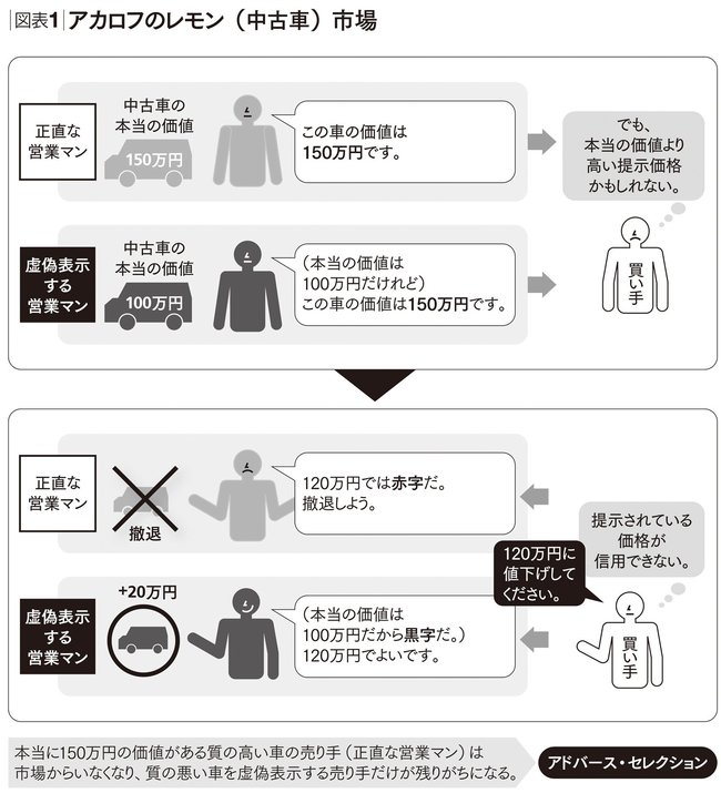この場合、本当に150万円の価値がある車を売りたい(正直な)営業マンは、120万円に値下げしては儲からないので、取引をしないことになる。結果、正直な営業マンは市場からいなくなり、本来100万円の価値しかない車を虚偽表示して売ろうとする営業マンだけが残る。まさに「悪貨が良貨を駆逐する」のである。