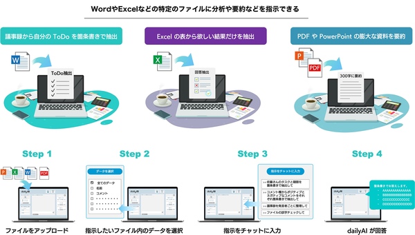 dailyAIはクラウドサービスであり、事前準備や初期投資をしなくてもすぐに利用を始められる。IDによるユーザー認証や利用ログの管理などセキュリティ機能が充実しているので、安心して使える。すでに提供が始まっている「マイデータ活用プラン」では、ユーザーの手元にあるWordやExcel、PDFなど特定のファイルを読み込ませることで要約や分析といった作業を指示でき、生産性向上に直結するサービスとなっている。