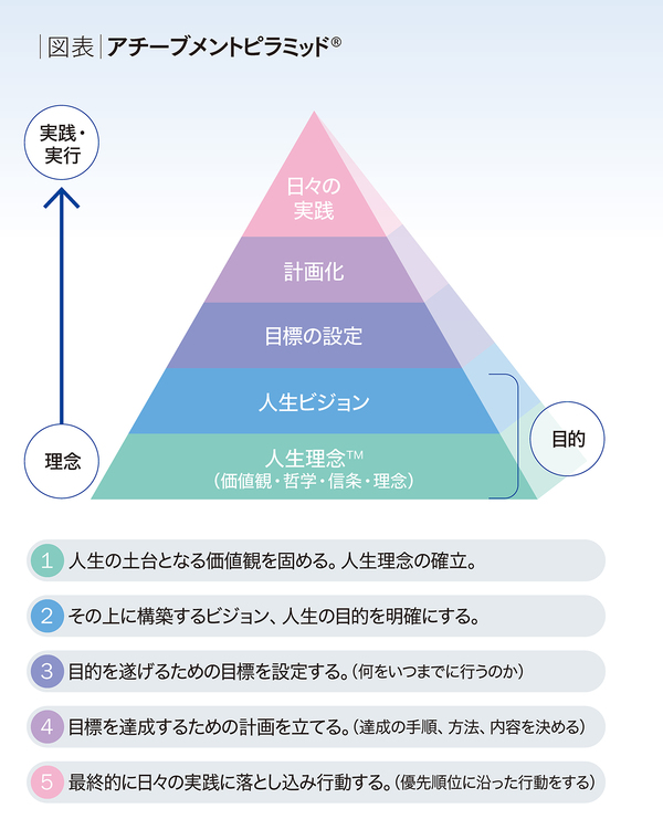 「昨今、『パーパス経営』の重要性が語られるようになっています。企業としての明確な理念やビジョンを掲げ、それを土台として、目標、計画、実践とピラミッドを積み上げていく経営のアプローチです。このピラミッドは、組織だけでなく、人についても当てはまります(下記図表参照)。経営者は、どのような会社をつくるべきかを考える前に、一人の人間としてどう生きたいか、人生のデザインを明確にする必要があるのです。