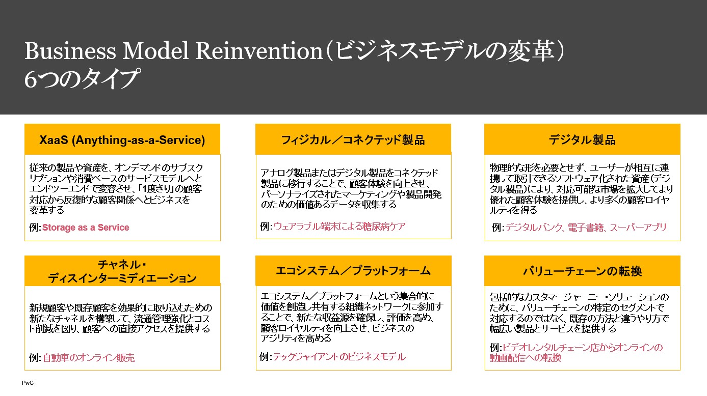 ビジネスモデル・リインベンションには、従来の製品や資産をオンデマンド型サービスへと変容させる「XaaS」(Anything-as-a-Service)、アナログまたはデジタル製品をコネクテッド製品へ移行し、パーソナライズされた製品・サービスを実現する「フィジカル/コネクテッド製品」、新たなチャネルを構築して顧客と直接つながる「チャネル・ディスインターミディエーション」など、大きく6つのタイプが挙げられます。