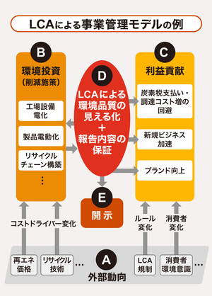 カーボンニュートラルに向けたアクションは、「環境投資施策」の立案・推進(B)、削減アクションを評価するための仕組みであるライフサイクルアセスメント(LCA)のケイパビリティ構築(D)、LCAによる環境品質を外部に発信する開示(E)、環境負荷低減を自社の利益につなげる活動(C)に大別できると考えます。