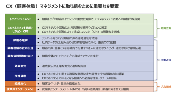 当社はこれまで600社以上をご支援する中で、CXマネジメントによって競争優位性を高め、持続的成長を実現していくうえで絶対に外してはならない9つの重要な要素を特定しました。それらは、「戦略立案」「仕組み化」「文化醸成」の3つにグループ化できますが、重要要素の筆頭に挙げられるのが組織トップのコミットメントです。