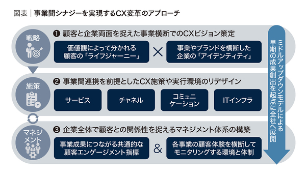 まず、戦略・ビジョンの壁を打破するには、事業横断で「自社グループらしさ」のある体験を提供するためのCXビジョンを策定する。その際は、顧客の価値観などを起点にライフジャーニーを可視化するとともに、企業全体の事業ポートフォリオや提供価値、それらを裏打ちする企業アイデンティティの棚卸しを行う。そして、変化する顧客ニーズに寄り添い、価値を提供し続けるための事業接点を整理する。