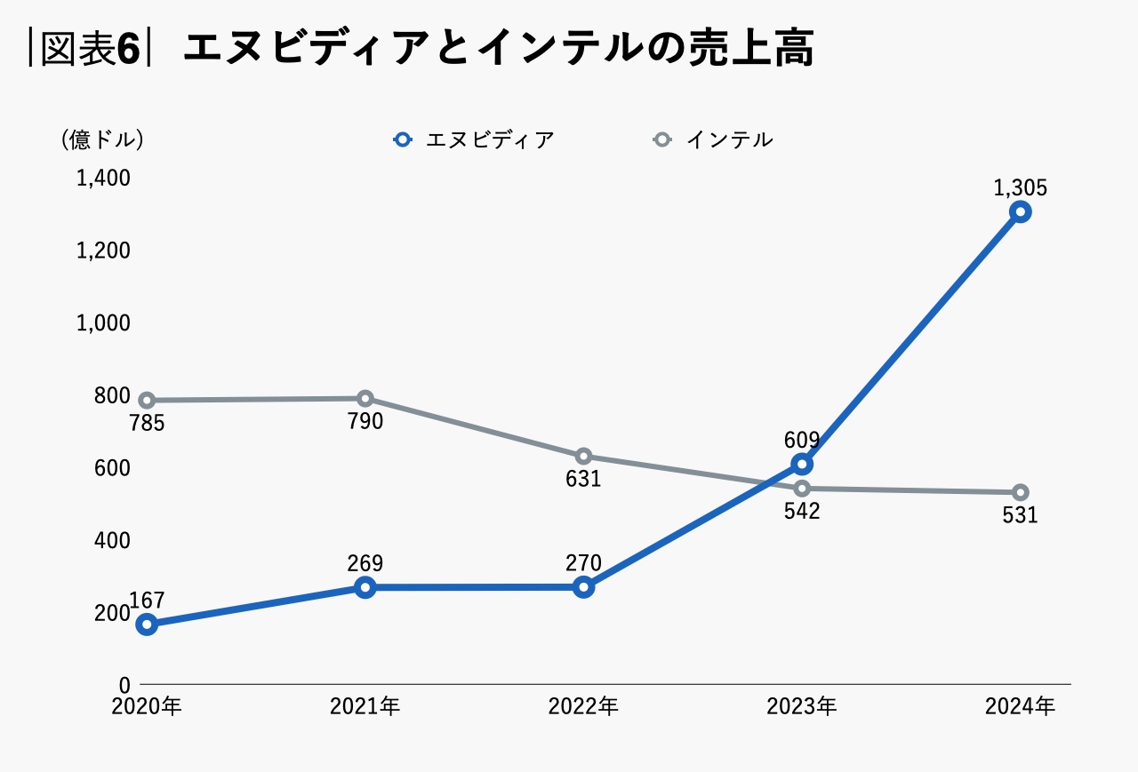 売上高に関しては、エヌビディアは半導体業界の王者と呼ばれたインテルを2024年1月期に抜き去ったかと思うと、その翌年(2025年1月期)にはインテルに対して2倍以上の差をつけるまでに成長しています。この数年で売上高を右肩下がりに落としているインテルとは対照的です(図表6)。