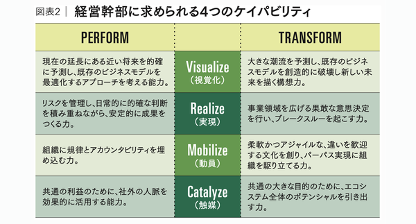 いまの時代は、不確実性と将来発生する危機の双方に対応できることがリーダーの条件です。そこで、「自社を越えたエコシステム全体と縦横に関わりながら“PERFORM(成果創出)”と“TRANSFORM(変革)”を両立できるアジャイルなリーダー」が必要です。