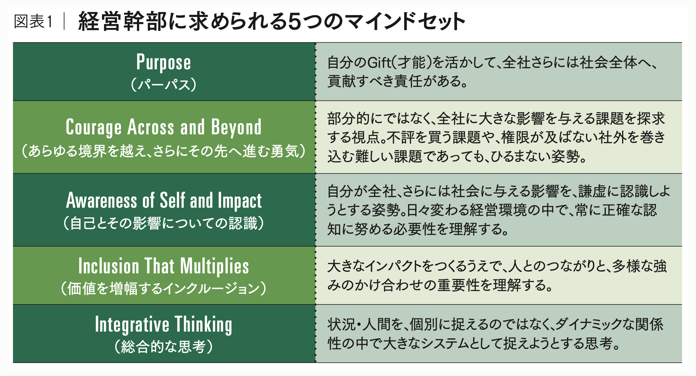 田中 まずマインドセットを強化すべきというのはまったく同感です。この5つのマインドセットはどれも本質的ですが、とりわけ「Awareness of Self and Impact」は、トップに近づくほど重要な要素だと思います。というのも、職位が上がるにつれて率直なフィードバックをくれる人が減っていくからです。自分を知るには他者の視点が不可欠です。外部コーチを活用して自己認識を深めるCEOが増えているのも、その必要性の表れでしょう。
