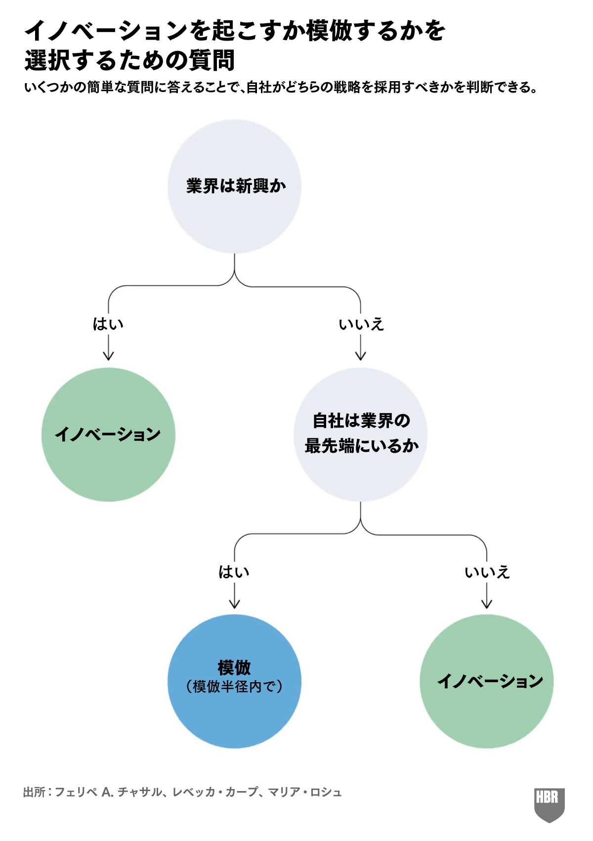 では、どのようにして、どちらの戦略を採用すべきかを判断するのか。意思決定を視覚化するための図表を作成した。要約すると、新興の業界ならば答えは明白で、イノベーションを起こすことである。反対に、成熟した業界ならば、競争上の自社のポジションに基づいて戦略を導くべきである。「模倣半径」、つまり追いつくことが現実的に可能な圏内の実績あるモデルに注力すべきである。