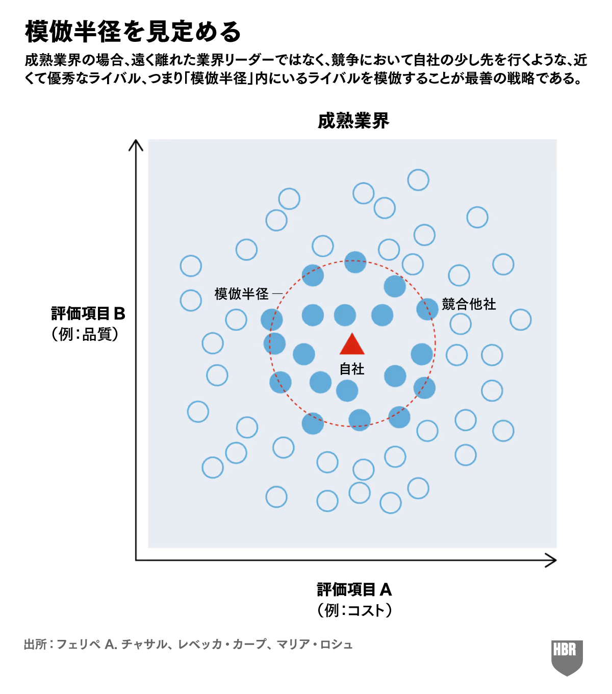 成熟した業界では、競争において自社の少し先を行く、自社に近いライバル、つまり、遠く離れた業界リーダーではなく、模倣半径内にいるライバルを模倣することが最善の戦略である(自社がリーダーである場合を除く)。