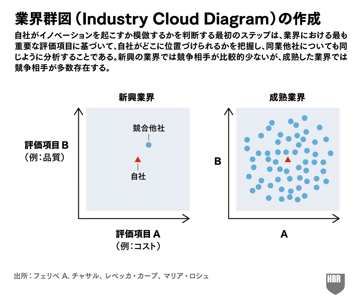 これとは対照的に、成熟産業では多くの企業がすでに市場を開拓し終え、可能な製品や領域をほとんど発見し尽くしている。地図がほぼ完成しているような状態だ。そのため、自社よりも比較的優位なポジションにいる企業を模倣することが改善の手段になる。
