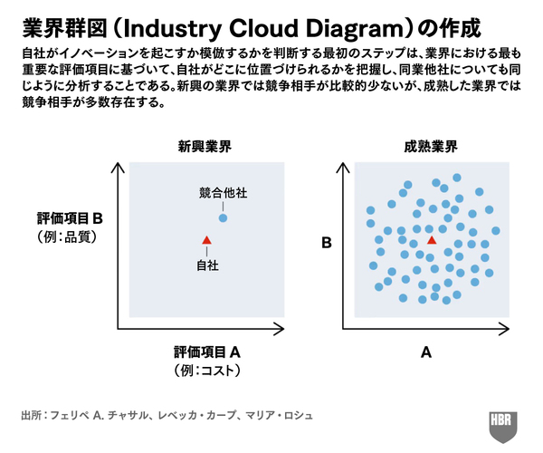 次に、それらの評価基準に照らして自社がどの程度評価されるか、また競合他社と比べてどの位置にあるかを分析する。下記の図表は、これらの比較を視覚化するのに役立つもので、筆者らは「業界群図」(Industry Cloud Diagram)と名づけた。