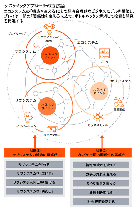 中島 一言で言えば「エコシステムの全体最適化」です。システミックアプローチでは、まずエコシステムの構造を明らかにし、変革の阻害要因のうち最も介入効果が高い「レバレッジポイント」を特定します。そこに多様なプレーヤーがテクノロジー、ファイナンス、ルールメイクといった観点から協調的・同時多発的に介入し、エコシステム全体の加速度的な成長を促していきます(図表2)。