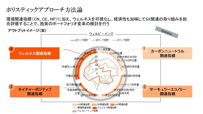 それらの総合評価を簡易的に行うためのサービスも開発中です。本サービスでは「カーボンニュートラル」「サーキュラーエコノミー」「ネイチャーポジティブ」「ウェルネス」の4つを軸としたレーダーチャートにより、各指標の負荷や効果を算出・可視化して総合評価します。競合との比較、あるいは複数の施策の優位性の比較ができ、サプライチェーン全体の総合評価が可能です。各社が取り組んでいるサステナビリティ施策の価値を貨幣価値換算することにも対応する予定です(図表1)。