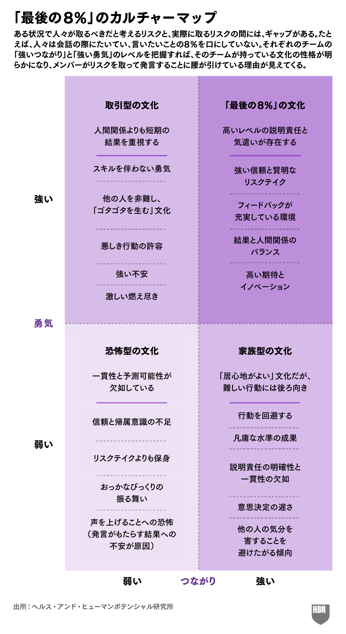 強いつながりと強い勇気が両方揃えば、信頼の文化が育まれて、人々がリスクを取ることが促される。つまり、「最後の8%」の文化が形成されるのだ。