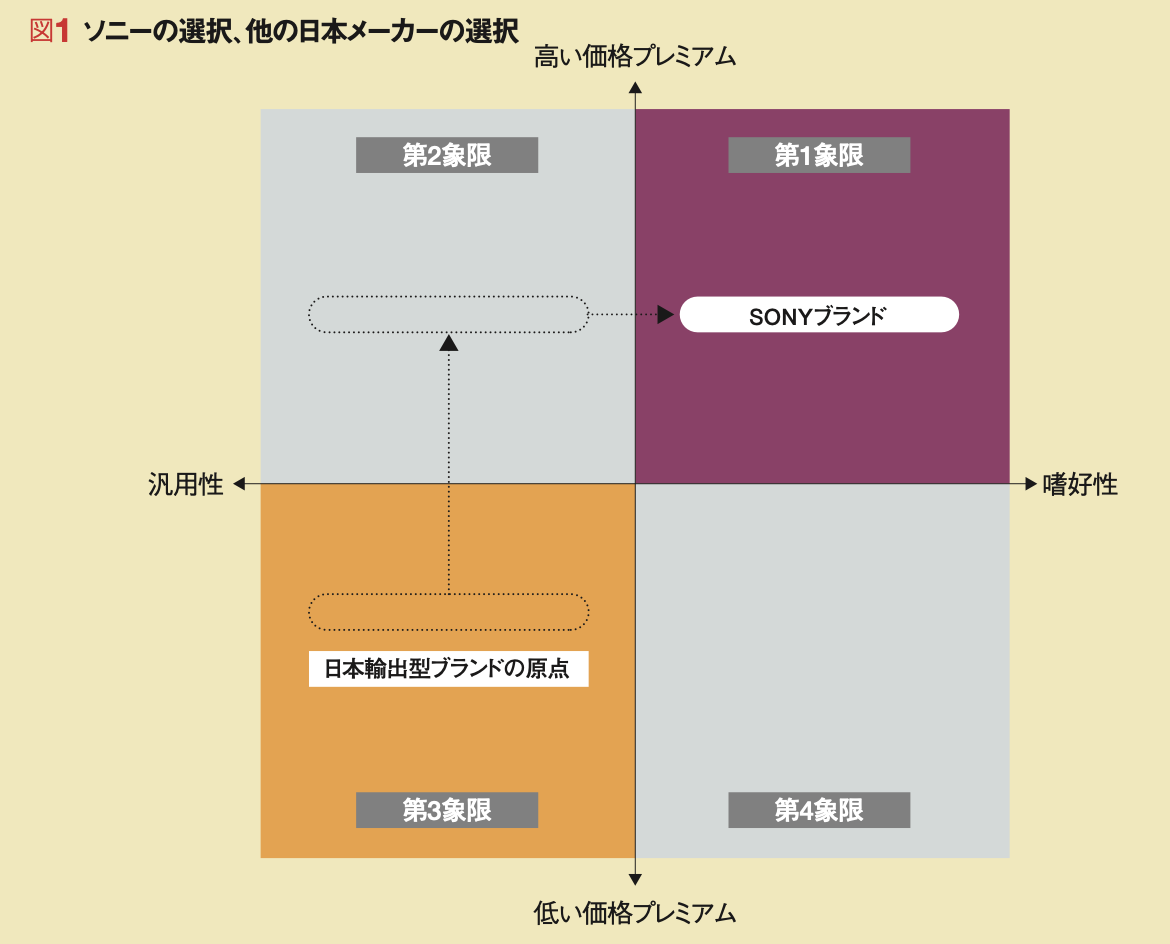 要するに、トランジスタ・ラジオという汎用品ながらも、ブランドをテコに価格プレミアムを獲得する戦い、すなわち図1の第2象限を選択したのである。加えてその後、第2象限から第1象限へと事業ドメインをシフトさせ、さらなる優位性と価格プレミアムの最大化に挑戦していく。