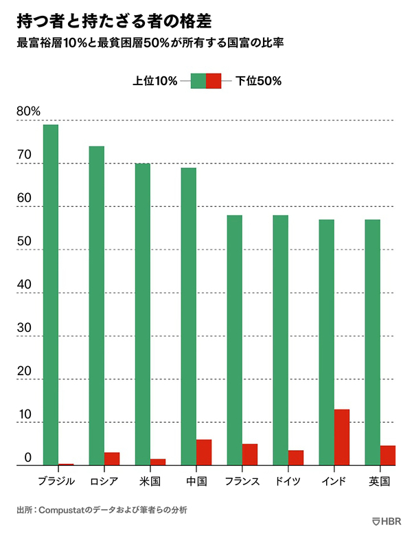 世界各地で、持つ者と持たざる者との格差は拡大しつつある。米国の世帯純資産は、主に好調な株式市場のおかげで、1989年から2024年までに134兆ドル増加した。この増分のうち68%は、資産額の評価における米国世帯の最上位10%が取得した。増分の30%は続く上位40%の世帯が手に入れ、下位50%の世帯が得たのは増分のわずか2%だった。米国の不平等は特に(悪)名高いが、ほとんどの国で、大きな富の格差は存在している。
