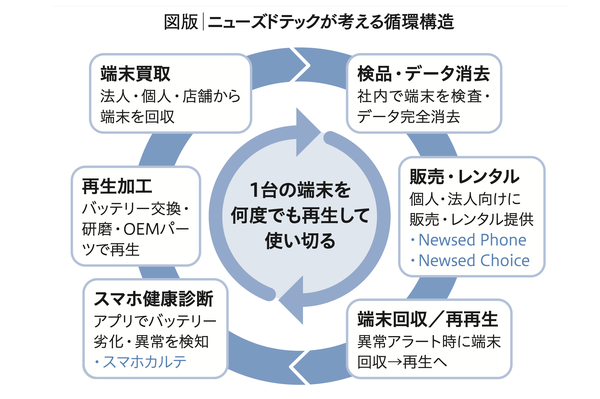 社会に不可欠な存在でありながら、消耗品のように扱われているデジタルデバイス。そこに新たな価値を再定義し、持続可能な社会へつなげていこうとしている企業がある。中古スマートフォンを、バッテリー交換や独自の研磨技術によって“新品同様”に再生して販売するニューズドテックだ。単なるリユースに留まらず、「エイジングケア」という新たなアプローチで価値創造に取り組む同社のビジネスモデルに着目した。