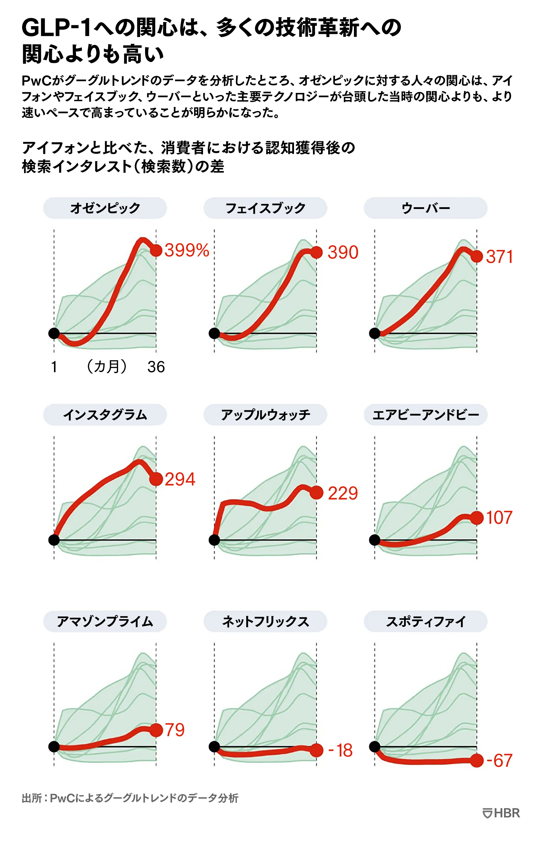 初期の動きを見ると、GLP-1受動体作動薬は、主要な技術的革新に匹敵するほどに、消費者行動や経済の変化を引き起こしている可能性がある。たとえばオゼンピックに対する消費者の関心は、アイフォンや他の多くの人気テック製品の検索トレンドよりも速く拡大している。しかし、それらのデジタル革新とは異なり、この破壊は生理学的なものである。生物学から始まるこの変容は、これまでヘルスケアから切り離されていたカテゴリーへと連鎖し、食品、ウェルネス、美容、小売、旅行といった産業間の境界を曖昧にしている。