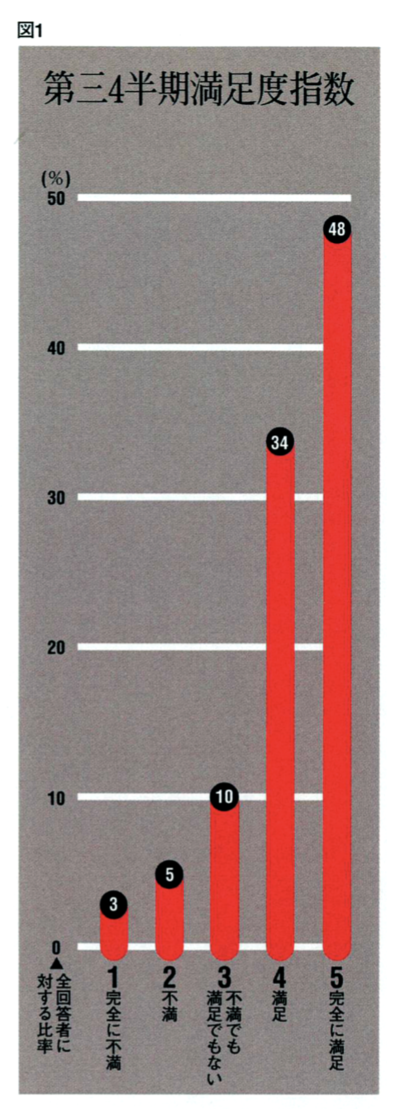 数項目の議題を省略して、全員で第3四半期の顧客満足度指数を検討することになり、オーバーヘッド・プロジェクターにシートが置かれる(図1〝第3四半期満足度指数〟参照)。調査対象となった顧客の82%が、4(満足している)あるいは5(完全に満足している)と回答している事実を、最高経営責任者が誇らかに指摘する。満足していないのはわずかに18%の顧客なので、会議の参加者はすべて、会社の運営状態は良好だと考える。