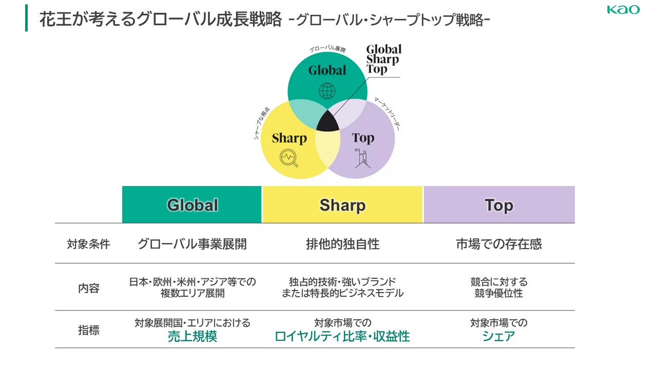 そこで同じ志を持っていた私は、「シャープトップ」という言葉でこれを定義し直すことにしました。「シャープ」は、狙いを定めた領域に対して切り口を鋭角に研ぎ澄まし、そこでは絶対に負けない領域を築くという考えを示しています。その領域で必ずトップを取り、かつその視座を世界規模へ広げていくという決意を込めて、「グローバル・シャープトップ」という造語を掲げました。