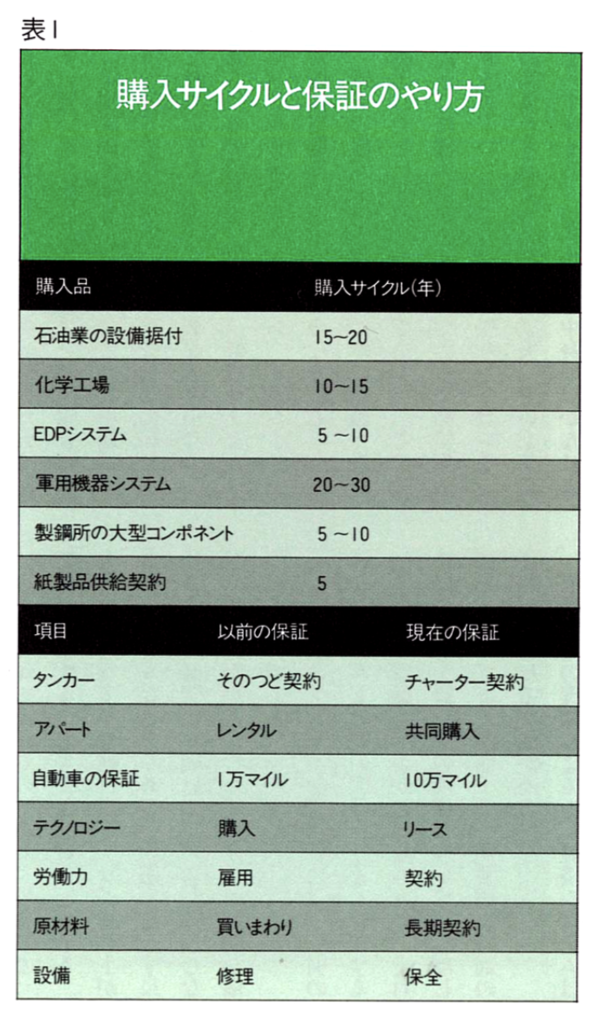 製品も大型になり、コンポーネントも大型になると購入サイクル(発注から購入完了までの期間)が長くなるために、売り手が配慮しなければならない買い手のニーズも変化してきた。大型購入契約の購入サイクルと、購入を完成させるのに必要な保証の仕方の変化について考えてみよう(表1)。このような状況の下での購入デシジョンというのは、一つの品目の購入デシジョン(恋の火遊びをする)ではなくて、不動の関係に参入するデシジョン(結婚する)なのである。だから、売り手になりたいと思う業者には、今までと違った目標および戦略が要求されるのである。