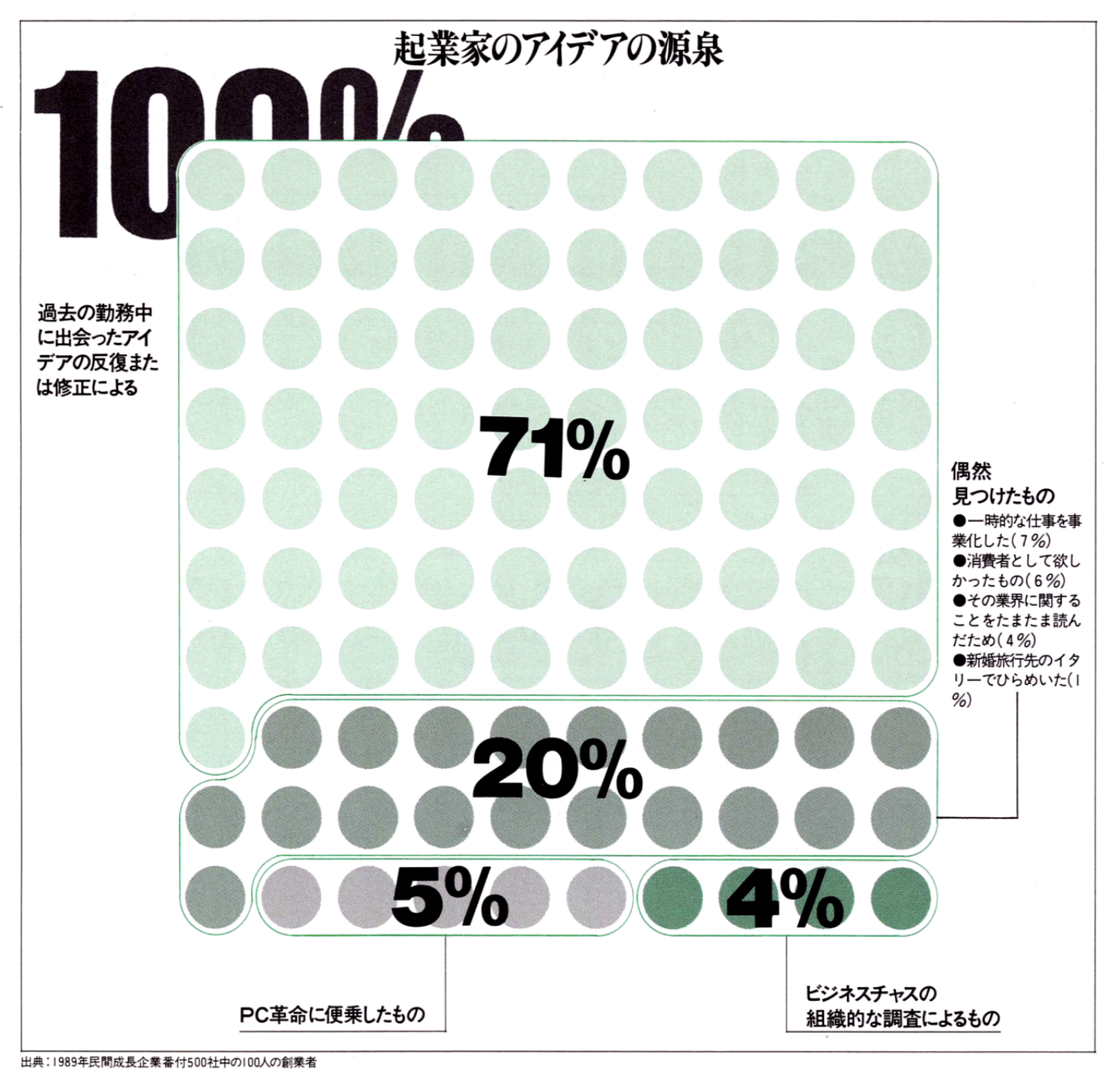勤務先の大学院の研究生による、「インク」誌1989年民間急成長企業番付「500社」から選んだ100社の創業者との面接調査と、100社を超える成長企業に関する調査によると、成功したアントレプレナーの多くは調査や分析にはほとんど時間を使っていないという結果が出た(囲み「プラニングはペイするか」を参照)。また、いったん立てた戦略をボツにして最初からやり直す例が多い。さらに、全米個人事業者連盟による1990年新規開業2994件の調査結果によると、検討、見直し、計画立案に長時間をかけた起業家がスタート当初の3年間を生き延びる可能性は、事業計画なしでビジネスチャンスを得た起業家より小さいことがわかった。事実、論理的分析を重視するわりには、企業のビジネスチャンスをつかむ能力はまことにお粗末である。分析を徹底するあまり参入のタイミングを逸したり、数多くの問題点を指摘しすぎてアイデアをつぶしたりする。