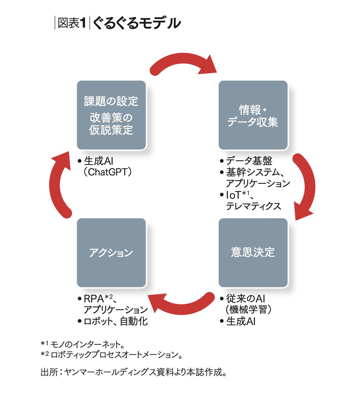 我々はPDCAを高速に回して、製品と内部プロセスの進化を飛躍的に加速させる取り組みを「ぐるぐるモデル」と呼んでいますが(図表1「ぐるぐるモデル」を参照)、生成AIはこれをいっそう加速させるカギになります。なぜなら、デジタル化によって、ビジネスというゲームのルールが変わったためです。