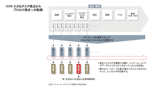 このため、いまは次の段階に進みつつあります。小さなタスク単位ではなくプロセス全体をゼロベースで見直し、エンド・トゥ・エンドでデジタルとAIを駆使した新しいプロセスにつくり変える取り組み、いわゆるBPR(ビジネスプロセス・リエンジニアリング)を強化しています。これによって、いままでは順番にやっていた工程を並列処理したり、工程そのものをなくしたりといった、抜本的な変革が可能になります(図表3「小さなタスク視点からプロセス視点への転換」を参照)。