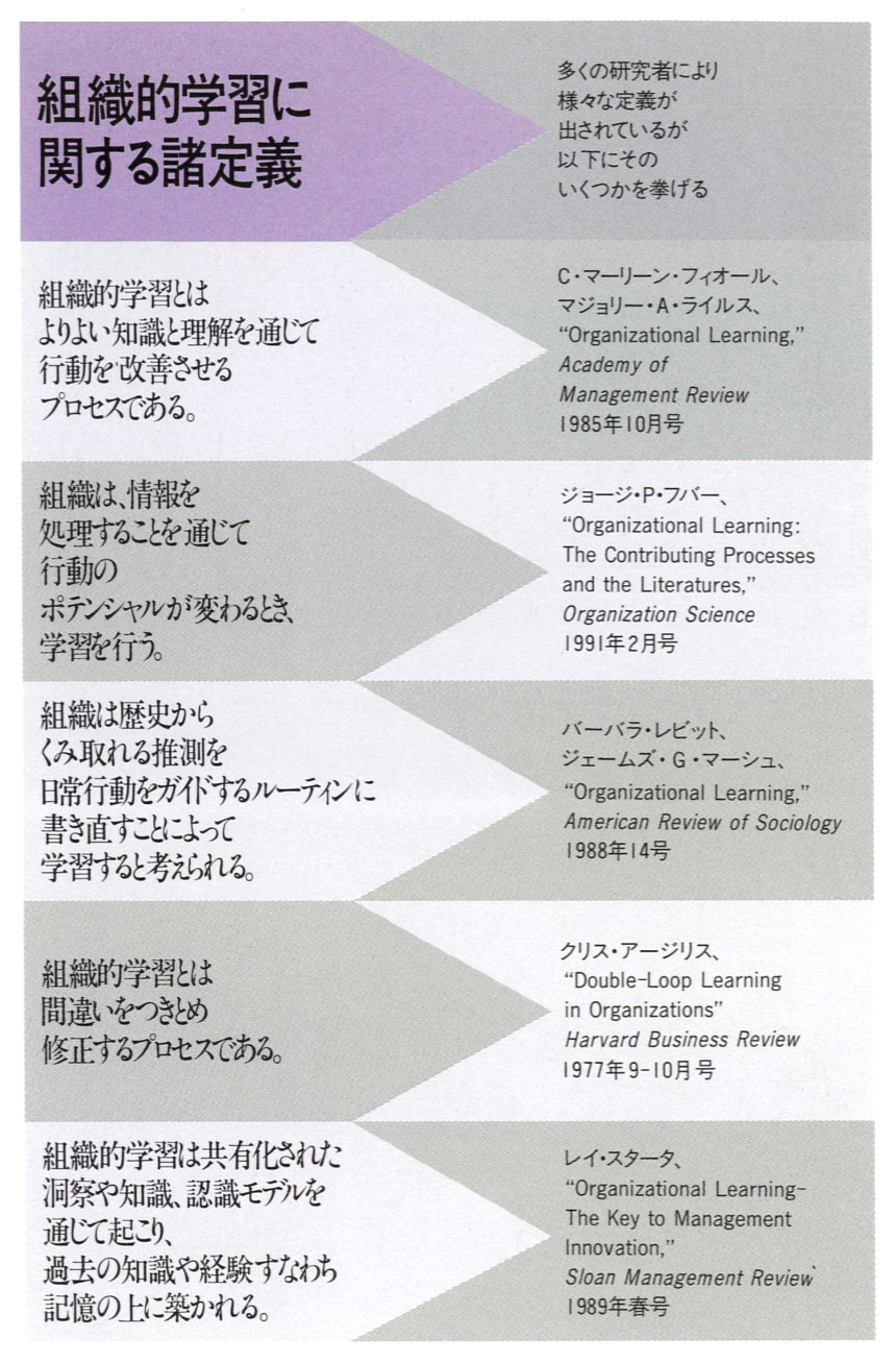 驚くことに学習についての定義は今でもあまりはっきりとしていない。組織に関する研究者の間でも学習についてはいろいろな見解が錯綜しているのが実情であり(囲み「組織的学習についての定義」参照)、組織的学習がその組織の長期にわたる知識獲得とパフォーマンス向上に関するプロセスである、というところまでは合意しているようであるが、その先はいろいろな見方に分かれている。