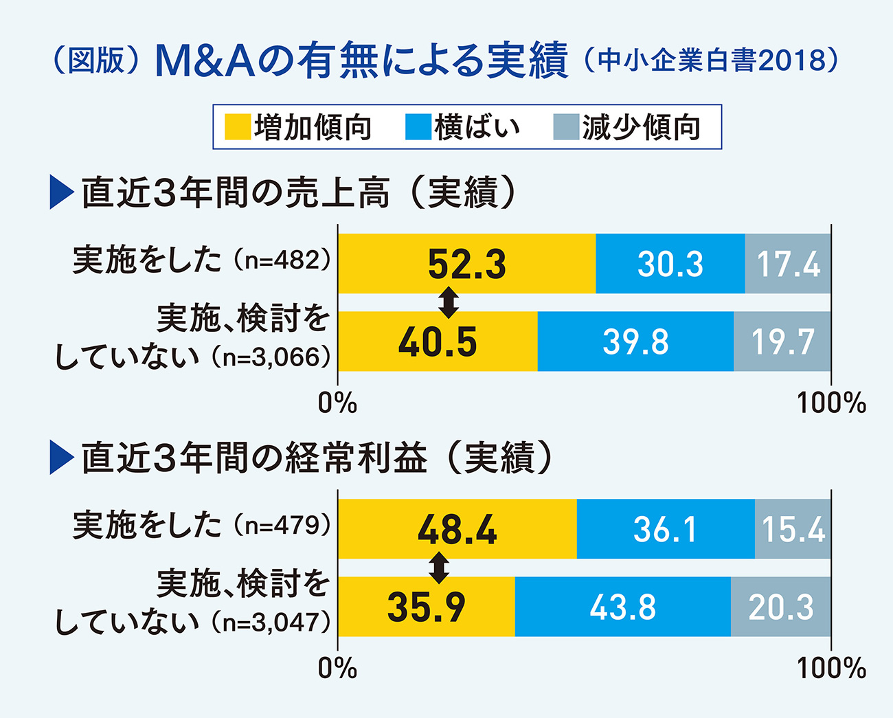 興味深いデータもある。中小企業庁の調査によれば、M&Aを実施した企業と、そうでない企業を比較した場合、前者のほうが生産性や収益性で上回る傾向が示されているというのだ(図版)。