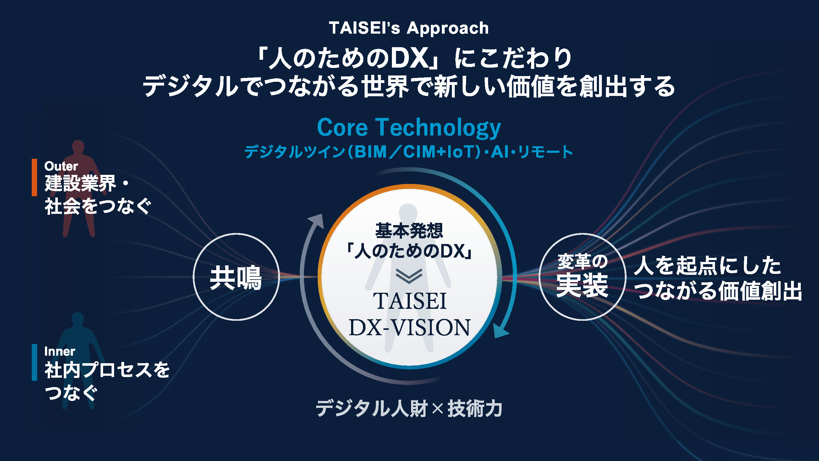 大成建設は今後、DXをさらに加速させるために「生産システムの変革」を起点とした「サービス・ソリューションのDX」を推進する。建設ライフサイクル全体をデータでつなぐことで、協力会社を含むサプライチェーン全体の変革を主導するとともに、データなどを活用した新たなサービスの提供や、施設の運用・保守(O&M)などの事業領域を拡大することで、「建設の枠を超えた新たな収益モデル」を確立することを目指している。