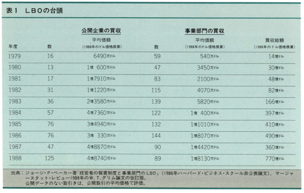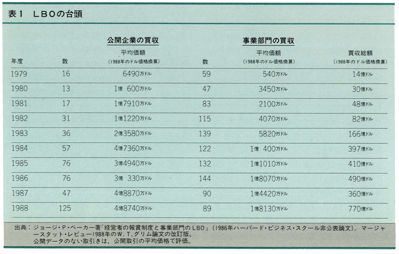 □最も広く行き渡っている非公開化取引であるLBOは規模が増すとともに頻度も増している。1988年には公開企業と事業部門の買収214件の総額は770億ドルを超えた。これは合併と買収すべての価額の3分の1に近い。1979年の買収75件の総額はわずかに13億ドルだった(1988年のドル価値に換算して)。これに反して1983年に完了した買収175件は総額で166億ドルだった。この過程は始まったばかりなのだ。1988年に行われたLBOの770億ドルは、社外所有公開企業株式のわずか2.5%にしか当たらない(表1参照)。