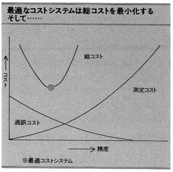 優れたコスト・システムとは、測定のためのコストと、不正確な情報による過誤のコストとを、総コストを最小化する形で均衡させているものである(図参照)。経済学者の指摘するように、最適システムは、システムの精度向上の限界費用が、その限界効用と正確に一致する点に存在するのである。