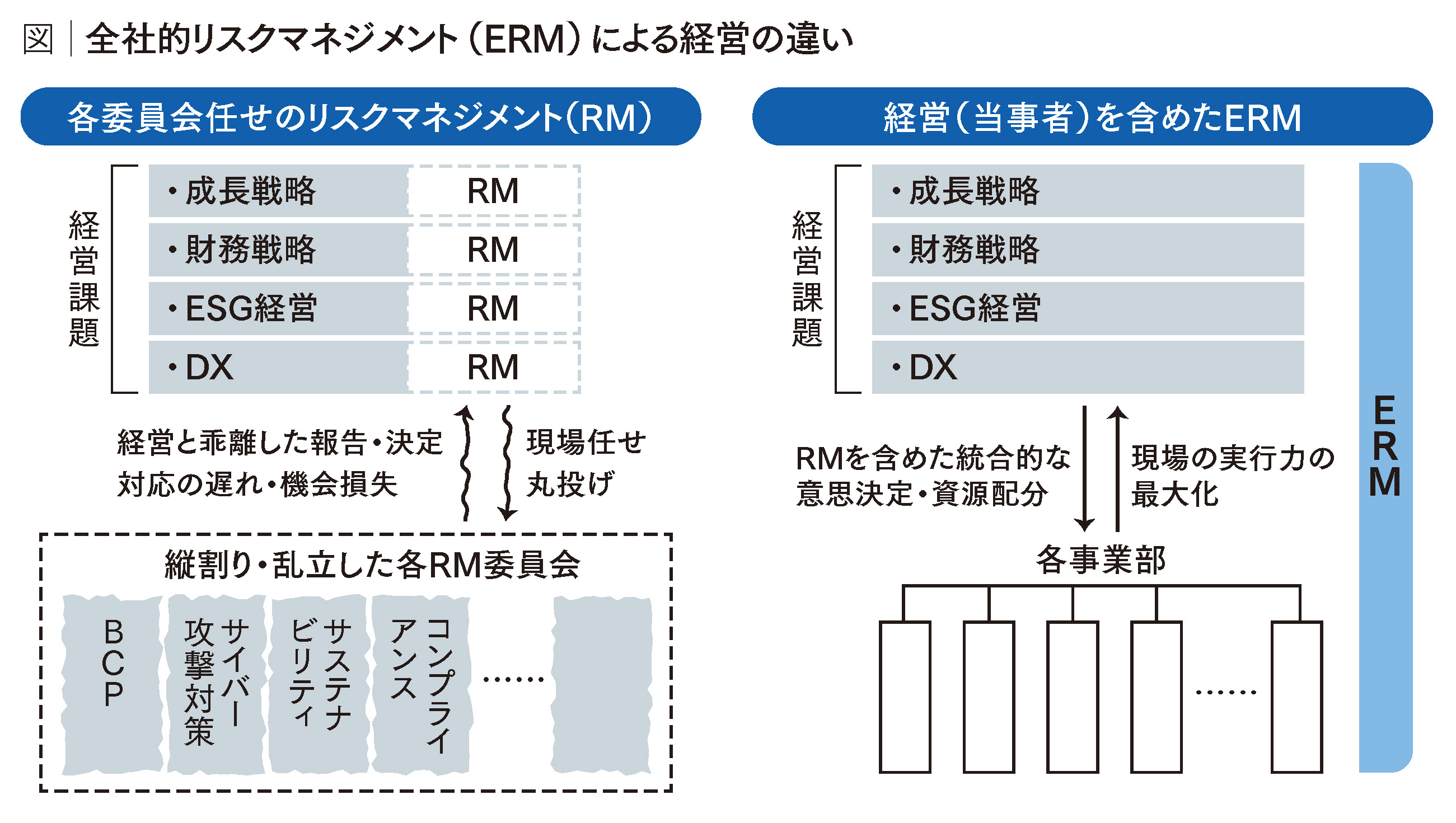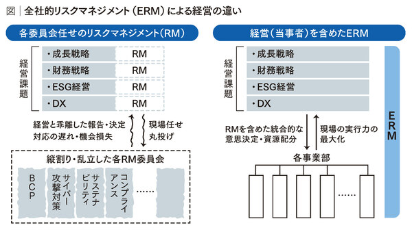 実際、多くの大企業では、リスクのテーマごとに委員会を設置し、縦割りで対策を実施している。経営者がそれらの委員会に対応を丸投げしている状態では、重大なインシデントへの初動は遅れ、取り返しのつかない損失を招く。