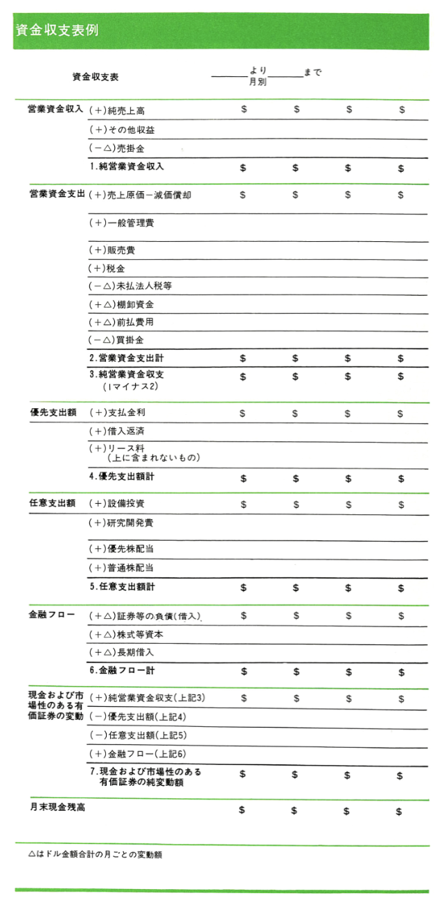 資本投資に必要な資金の必要額を見積もるために、以下に示したような資金繰り表を用いるとよいだろう。この表の最初の3つの項目(営業資金収入と営業資金支出と純営業資金収支)は、企業の基本業務に関するものである。営業資金支出を営業資金収入から差し引くと、純営業資金収支額(NOCF)が得られる。これは企業を運営していくのに必要な資金額である。