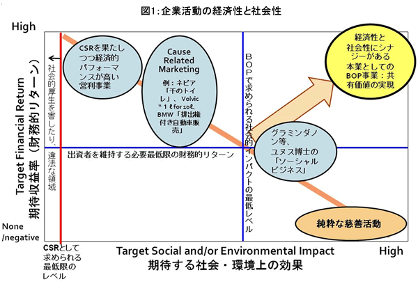 フリードマンの考え方は、これら両極の異なる事業間にあって、経済的効果と社会・環境的効果はトレードオフの関係(図1の中で左上から右下へ伸びる斜め45度線)にあるというものだ。すなわち、企業による社会性の追求は、経済性の犠牲の上に成り立つものであるから、企業による社会性追求は株主への背任的行為とみなされる。この考えは資本市場や企業経営者の間で今でも根強い説得性を持っている。