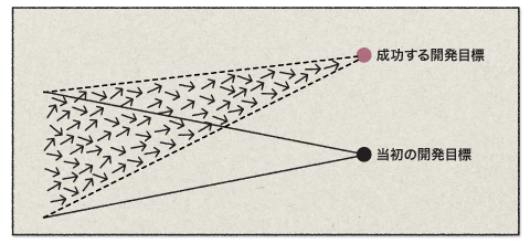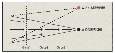 ウォーターフォールやステージゲート法の開発アプローチでは、早い段階でコンセプト仮説を絞り込み、少ないテーマに集中したほうが開発の質とスケジュールを管理しやすいという考え方が前提にあります。そのため、前工程が完了するまで次工程に進まないことで手戻りを最小限にする、そのために各工程の間にゲートを設け、ゲートの評価項目をクリアしたテーマだけを次の工程に進めるという方法をとります。しかし、飛躍的なイノベーションを実現するうえでは、このアプローチには多くの限界があります。