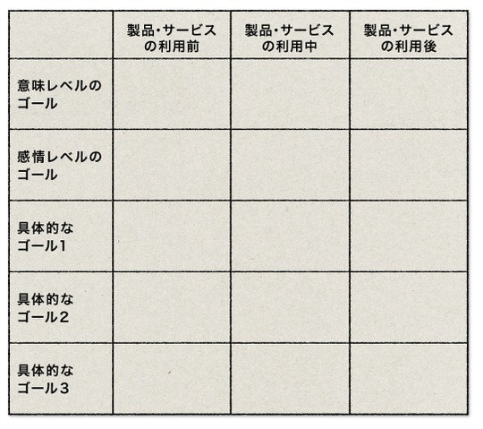 まず、アイデア創出のフレームワークをご紹介しましょう。わたしたちがよく使うフレームワークは、横に顧客が経験することを「製品・サービスを利用する前」「製品・サービスの利用中」「製品・サービスの利用後」という3つのステージに区切り、縦に「意味レベルのゴール」「感情レベルのゴール」「具体的なゴール(3程度)」を並べたものです。