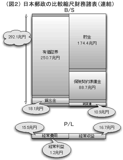 日本郵政の総資産292.1兆円というのは、実に巨大な数字である。三菱東京UFJ銀行を有する三菱UFJフィナンシャル・グループの2012年3月期の連結貸借対照表の総資産が218.9兆円だから、その約1.3倍に相当する。