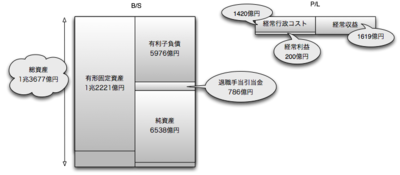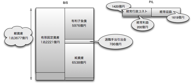 地下鉄という典型的なインフラ系の事業であるだけに、財務諸表も一見してわかるとおりインフラ系の特徴を示している。大きな貸借対照表に小さな損益計算書、そして、貸借対照表のほとんどを有形固定資産が占めている。