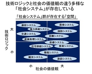 「社会システム」も多様である。確かに技術中心のものも多い。「通信システム」とか「交通システム」などがそうである。しかし、「訴訟システム」、「教育システム」のように技術よりも社会の価値観の方が重要なシステムもある。「医療システム」はその中間である。多くの「社会システム」はこのように技術と社会の価値観の両方の重要度の違いでいろいろなタイプがある。また、「電力供給システム」はこれまでの技術中心から原発の問題で、最近は社会の価値観の影響の強いシステムに変わっている。