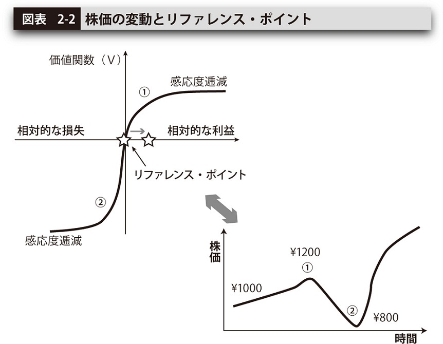 リファレンス・ポイントは、購入した価格の1000円である。①の局面では200円の含み益、つまり、心理的にプラスの価値が発生したことになる。一方、株価が1200円から②の800円に下落したときはどうか。損失が出ているため、当然、心理的にもマイナスの価値が発生していることになる。基本的に投資家は、そこで発生している価値に基づいて行動することになるはずだ。200円のプラスの価値が出ているとき、それをさらに増やそうと思えば、当該株式を売却せずに保有を続けることになるだろう。