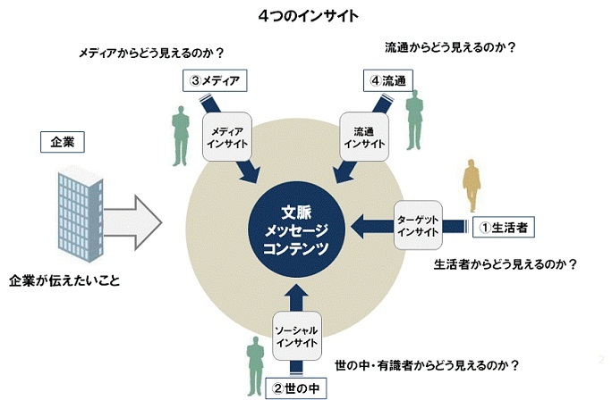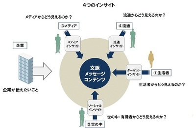 私が代表を務めるインテグレートではマーケティング・ストーリーを描くために、情報クリエイティブというメソッドを使って、ステークホルダーのインサイトを探索します。特に、「消費者」「メディア」「ソーシャル」「流通」の4つのインサイトを重視して調査を行います。