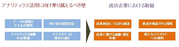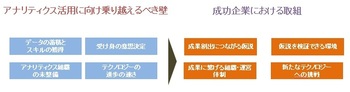 技術の進歩が激しいアナリティクスの分野では、一見事業での適用が難しそう、あるいは現在は保有していない分析技術や情報を利用するものもある。このような場合においては、失敗のリスクを恐れず新たなテーマに挑むことができる環境を整えることが必要だ。