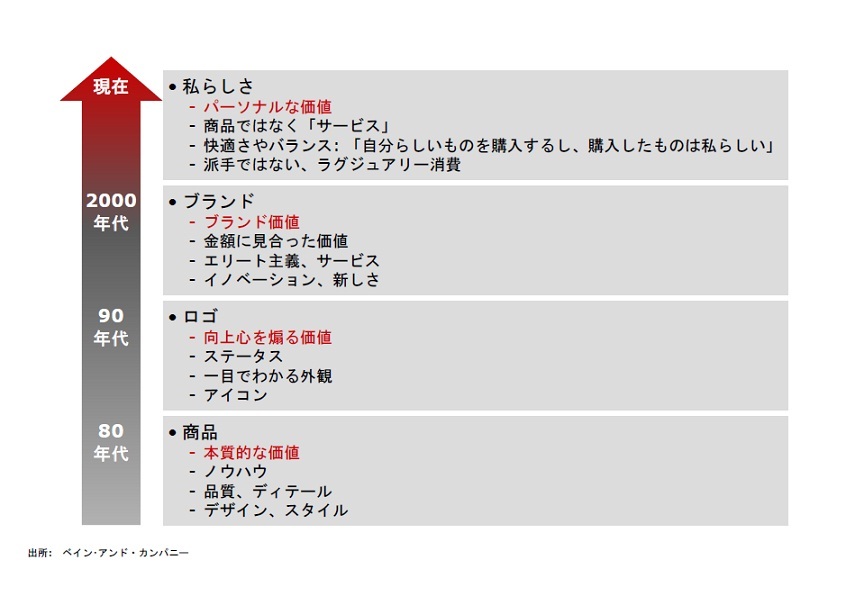 ラグジュアリー・ブランドにとって一番の危機は、商品が価格や機能で比較されてしまうことだ。実際に価格比較サイトなどを利用して、オンライン・ショッピングで安さを追求する消費者も増えている。また、ブランド価値の評価も、これまではブランド自身が歴史やクラフトマンシップといった物語を通じて表現してきたが、いまや個人ブロガーやソーシャル・メディアの情報を消費者が重視するようになった。ネット上のクチコミは、もはや企業側ではコントロールできない。そしてなにより、消費者がラグジュアリーに対して何を求めるかが明らかに変化しつつある(図表を参照)。とりわけ日米欧の成熟市場においては、もはやロゴでもなくステイタスでもなく、いかに自分らしい経験ができるかに関心がシフトしているのだ。