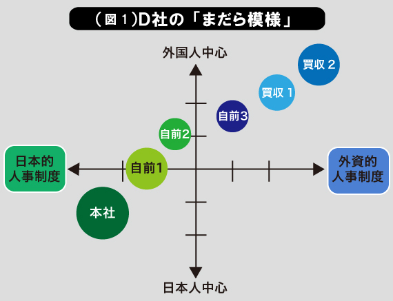 早速、私がなじんでいるD社を見本に取って染色(診断)すると、濃い緑=日本本社、薄い緑=アジア地域の自前の拠点、緑が少し混ざった青=欧米地域の自前拠点、青=アジアで買収したグローバル企業、真っ青=米国での買収先というまだら模様が浮かび上がる。