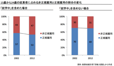 このグラフは、2002~2012年までのデータを元にしていますが、それ以前には「就学中」と「未就学」グループを区別した非正社員データはありませんでした。大学進学率が著しく上昇した2002年以前のデータもあれば、この傾向はより顕著に示されたのではないかと考えています。