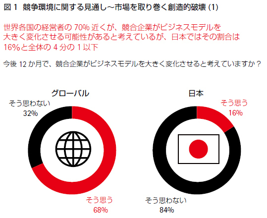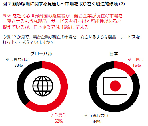 ところが、日本の経営者は、他国の経営者と比較して、市場におけるさらなる創造的破壊が起こる可能性をかなり低く見積もっている。競合企業がビジネスモデルを大きく変化させる可能性があると答えた経営者の割合、および競合企業が現在の市場を一変させるような製品・サービスを打ち出す可能性があると答えた経営者の割合は、両者とも日本ではわずかに16%に留まっている。