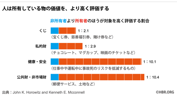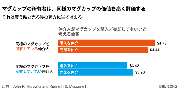 ある実験では、3つのグループを比較した。(1)マグカップを与えられ、それを売る人(所有者・売り手)。(2)マグカップを与えられず、それを買う人(非所有者・買い手)。さらに、(3)マグカップを与えられ、同じマグカップをもう1つ買い足す人(所有者・買い手)である。すると、所有者・買い手の支払い意思額(4.52ドル)は、所有者・売り手の提示額(4.26ドル)と近かった。そしてどちらも、非所有者・買い手の支払い意思額(2.22~2.47ドル)を上回っていたのである。
