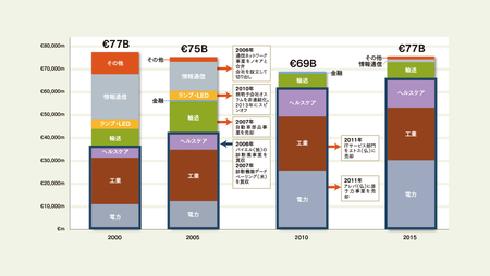 シーメンスは、2000年代には売上げの5割に満たなかったヘルスケア、工業、電力の事業領域を過去15年かけて着実に積み上げてきた。その過程では、5度にわたる大型の事業売却、2度の事業買収を行い、資金を重点領域に振り替えていった。2000年時点では主力事業の1つであった情報通信とランプ・LED事業はほぼすべて売却され、輸送領域の事業も現在は中核分野から外されている。