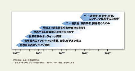 図3は、アマゾンのミッション(企業理念)の骨格の変遷について、SEC filing(10-K)における記述の変化から読み解いたものである。上場時に「オンライン書店」と自社を定義していたアマゾンは、その後、音楽やビデオの販売を急速に伸ばし、さらに小売全般へと事業を広げていった。また2007年からは、これまで暗黙的に「顧客」という名称を使っていたのを、消費者だけではなく、販売業者、開発者も含めて顧客であることを明確化する。さらに2011年からは、コンテンツ生産者も顧客の一部として再定義して、現在に至っている。